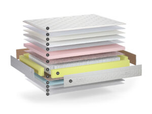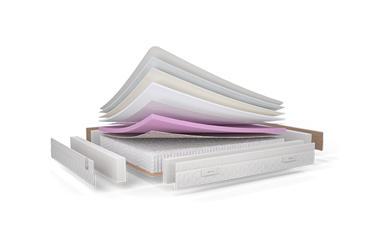 Su núcleo combina la resistencia de Firmsoja 35 kg/m³, una espuma HR de alta densidad con aceite de soja, y el material Perfilconfort, que distribuye de manera uniforme la presión del cuerpo y mejora la sensación de apoyo. Esta unión proporciona una base robusta y perfectamente equilibrada.